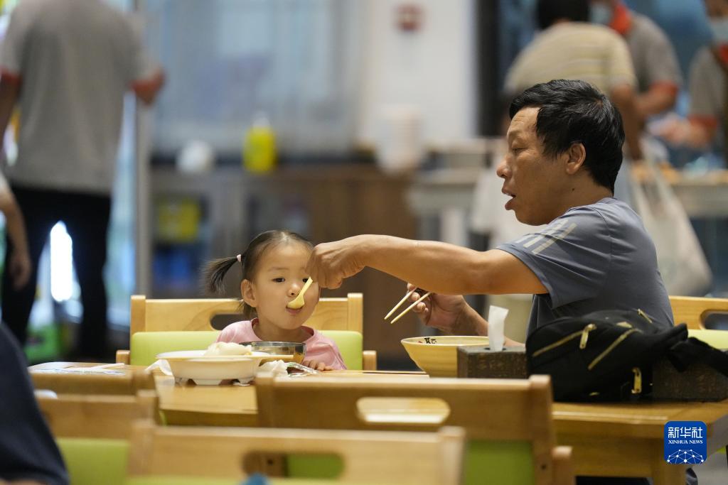 7月25日,老人帶著小孩在河北省唐山市路北區橡樹灣社區養老服務中心就餐。