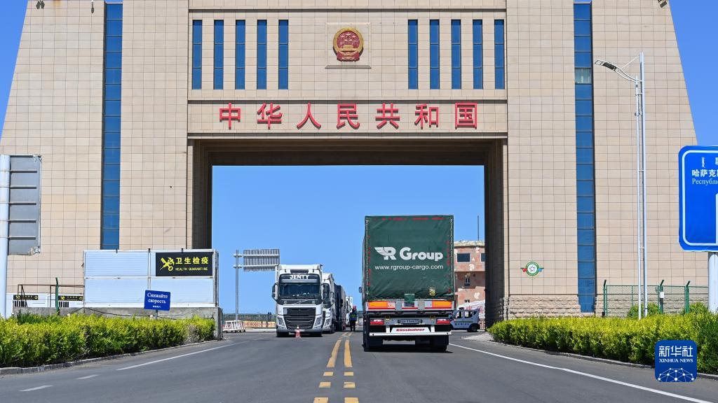 在新疆阿拉山口口岸,幾輛貨車在進出國門(7月24日攝)。