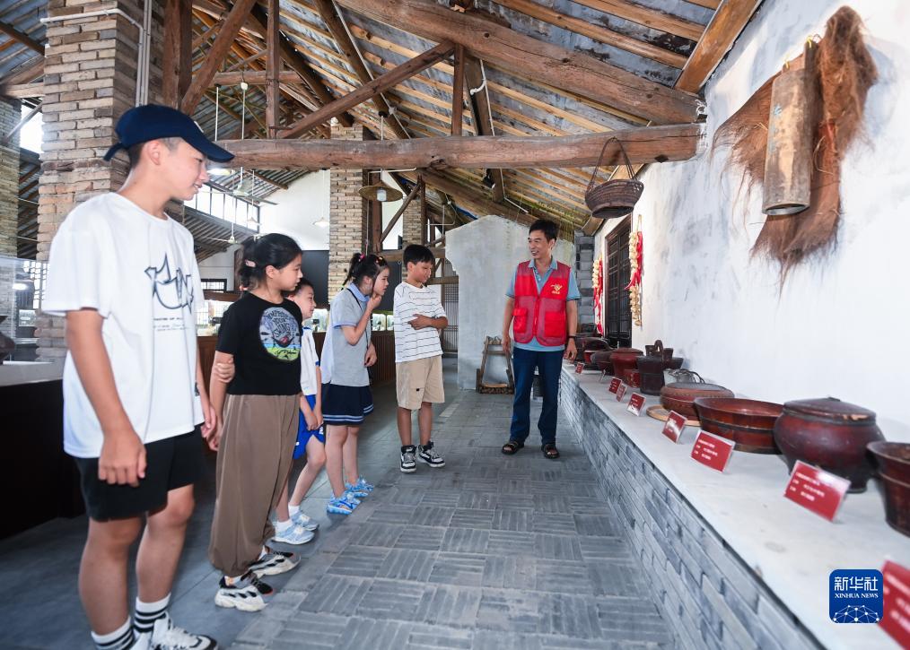 7月25日,在諸暨市馬劍鎮(zhèn)狀元村,志愿者給暑托班的孩子們介紹村博物館里的各類傳統(tǒng)用具。