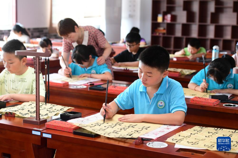 7月25日,孩子們在合肥市肥西縣紫蓬鎮(zhèn)中心學(xué)校少年宮練習(xí)書法。