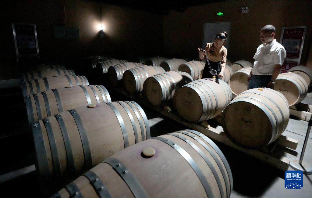 7月19日,中衛市漠貝葡萄酒莊的工作人員在地窖提取酒樣,進行檢查。