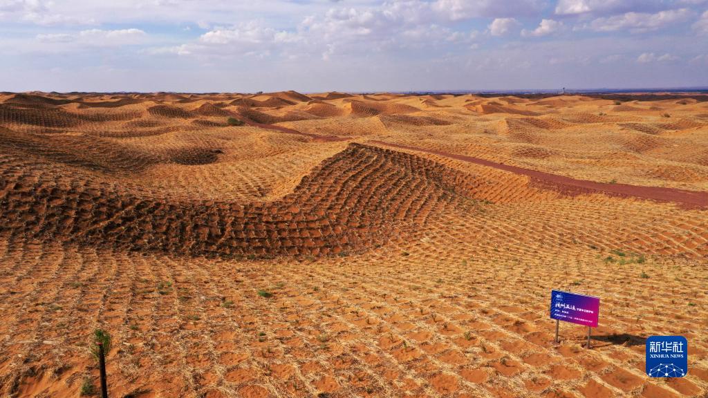 位于寧夏中衛市境內騰格里沙漠的杭州亞運會寧夏中衛防護林(7月19日攝,無人機照片)。