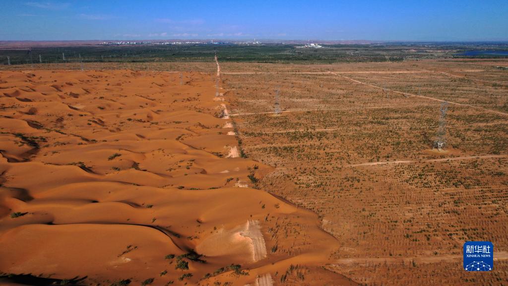 位于中衛(wèi)市沙坡頭區(qū)騰格里沙漠邊緣的防護(hù)林帶與沙漠交匯處(7月21日攝,無(wú)人機(jī)照片)。