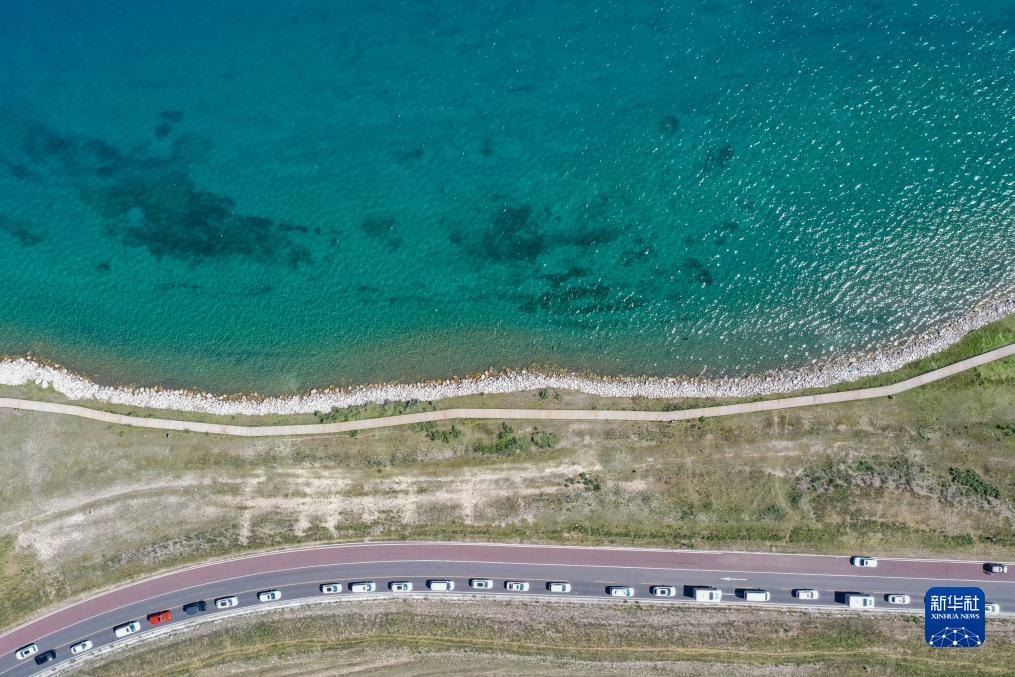 7月25日,車輛排隊進入新疆賽里木湖景區(無人機照片)。