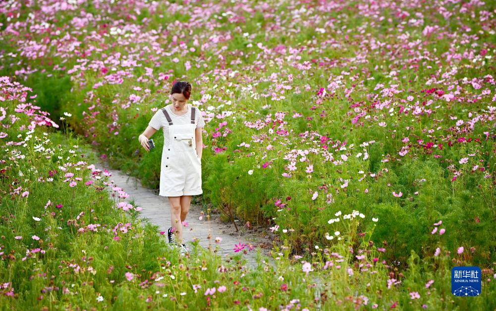 游客在陜西省漢中市留壩縣城金水灣花海游玩(7月24日攝)。