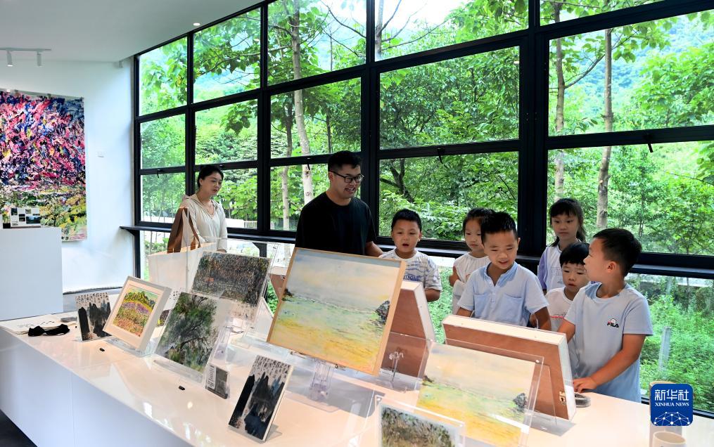參加研學的小學員在陜西省漢中市留壩縣小留壩村樓房溝玉雙美術(shù)館內(nèi)參觀(7月24日攝)。