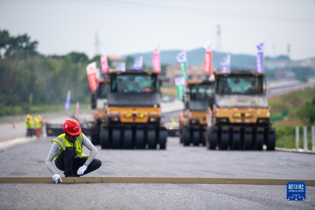 7月25日,在衡永高速路面工程施工現(xiàn)場,工人在檢測瀝青攤鋪平整度。
