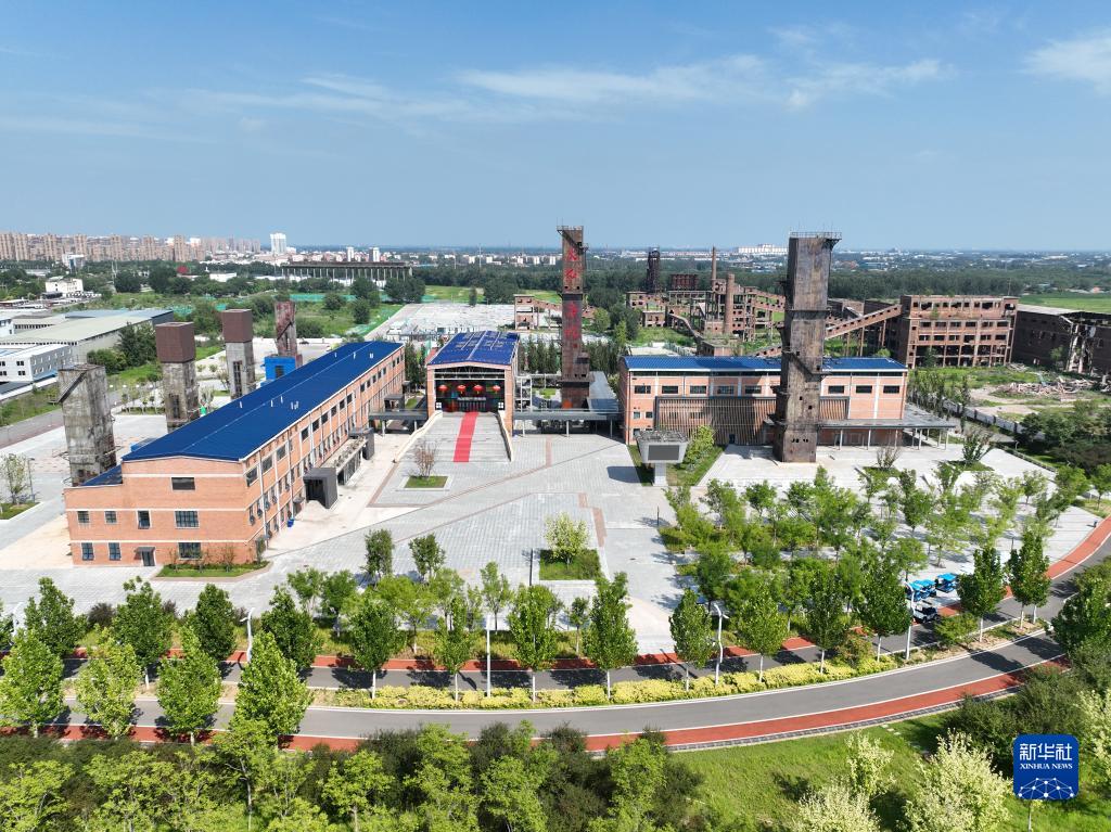 7月25日拍攝的唐山花海景區內由廢棄工廠改造而成的景點(無人機照片)。
