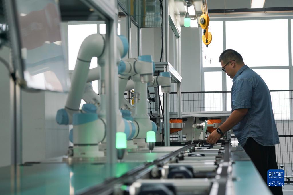 7月25日,在位于淄博市臨淄區(qū)的遨博(山東)智能機(jī)器人有限公司,工作人員在調(diào)試設(shè)備。