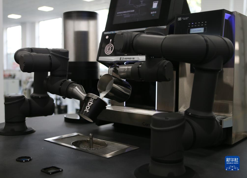 7月25日,在位于淄博市臨淄區的遨博(山東)智能機器人有限公司,機器人在制作咖啡。