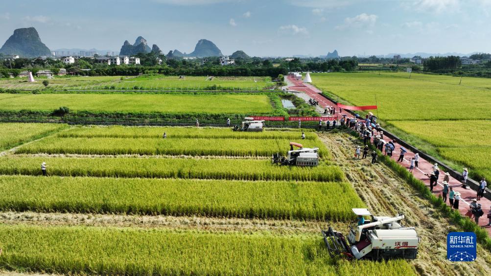 7月25日,在柳州市柳江區(qū)進(jìn)德鎮(zhèn)泗浪村,農(nóng)機(jī)手駕駛收割機(jī)參與水稻機(jī)收減損技能比武(無(wú)人機(jī)照片)。新華社發(fā)(黎寒池 攝)