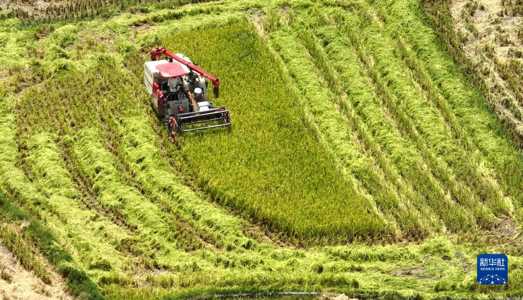 7月25日,在柳州市柳江區穿山鎮林寺村,農民駕駛收割機收割早稻(無人機照片)。新華社發(黎寒池 攝)