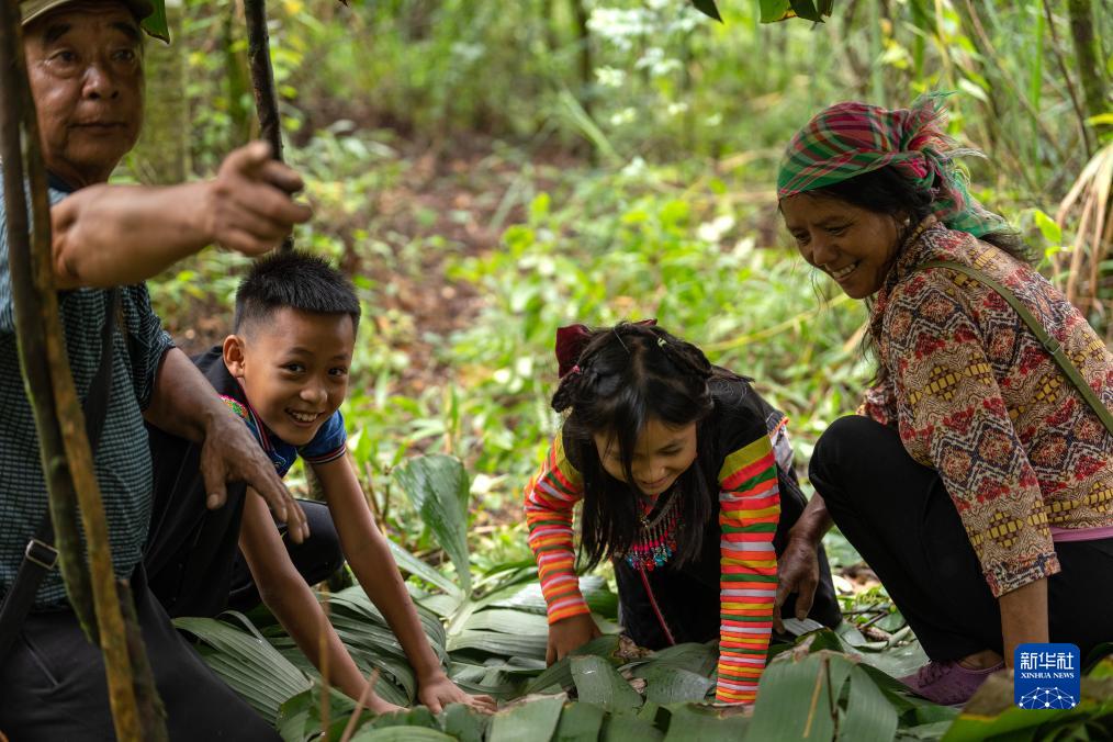 7月23日,張普忠(左一)和老伴王素英(右一)、孫子張偉軍(左二)、小孫女張麗紅一起鉆進芭蕉葉棚子。新華社記者 費茂華 攝