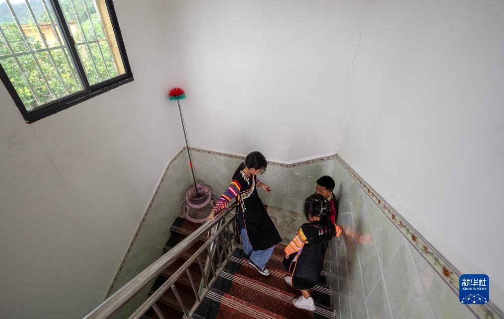 7月23日,張普忠的大孫女張英(左)、小孫女張麗紅(中)和孫子張偉軍在家里玩耍。新華社記者 費茂華 攝