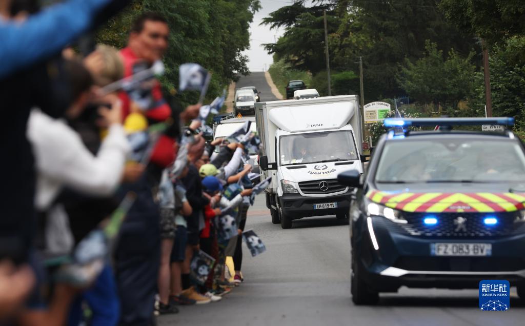 7月25日,在法國圣艾尼昂市博瓦勒野生動物園外,人們送別搭載熊貓“圓夢”的車離開。