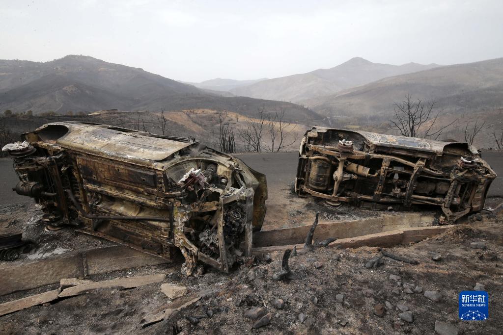 這是7月25日在阿爾及利亞貝賈亞省拍攝的被野火燒毀的車輛。