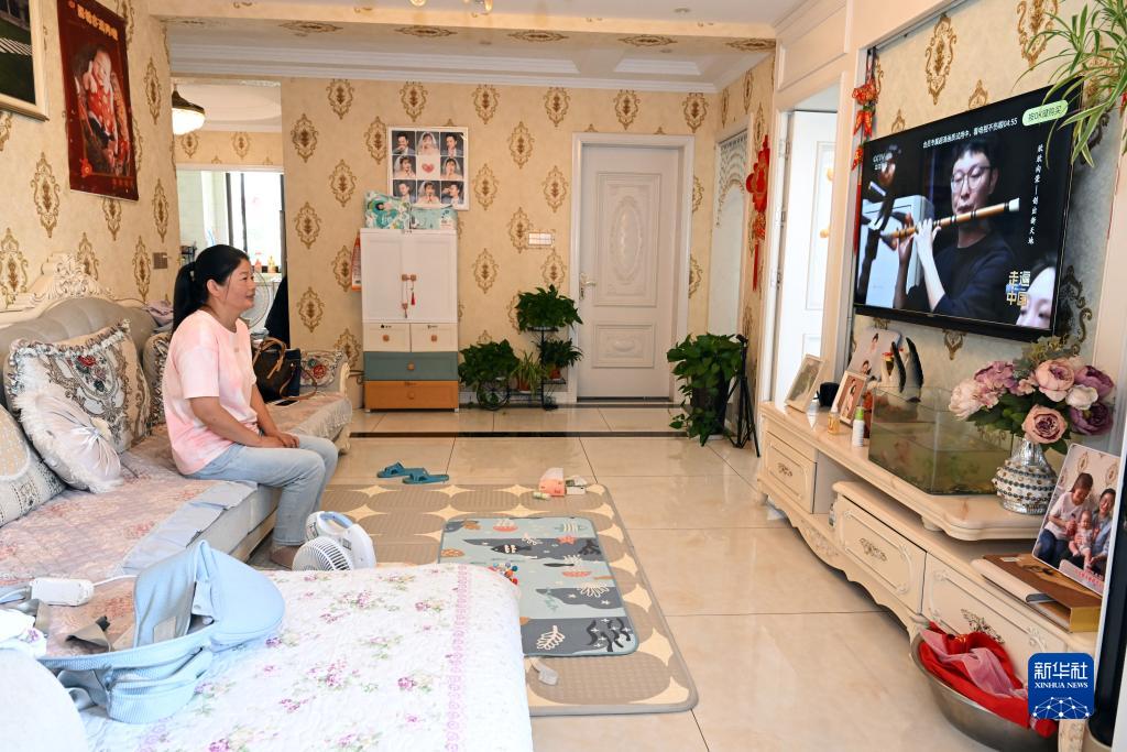 7月24日,陳蘭香在上岸后的新家里看電視。新華社記者 周牧 攝