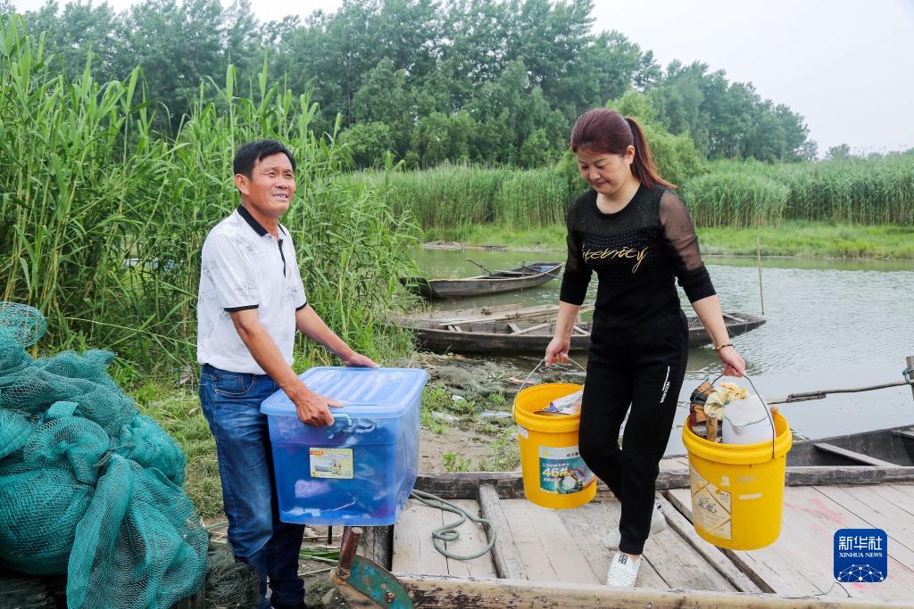 在馬鞍山薛家洼,陳蘭香(右)和丈夫張周華搬遷上岸(2019年5月15日攝)。新華社發(畢琛攝)