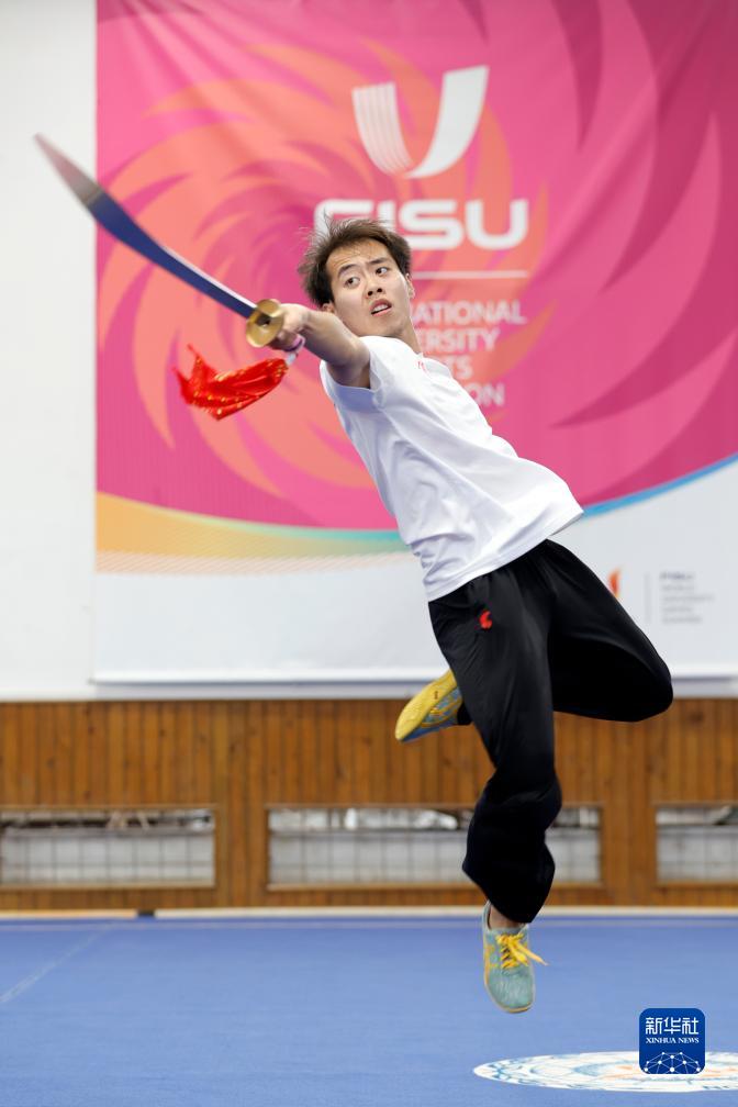 7月25日,參加第31屆世界大學生夏季運動會武術比賽的中國選手金哲典在成都城北體育館訓練。