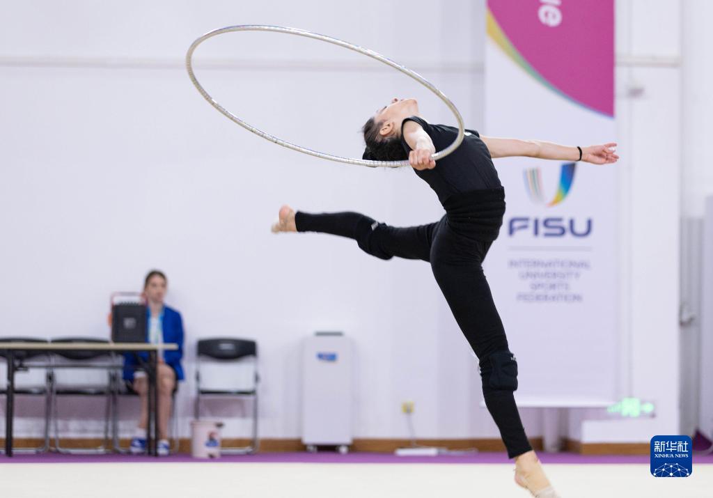 7月25日,阿塞拜疆大學生藝術體操隊的選手在成都體育學院體操館訓練。