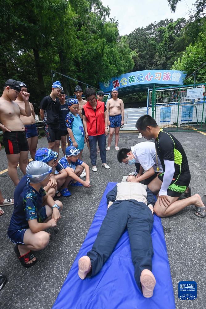 7月26日,道場鄉衛生院的醫生和志愿者老師在“蒲公英愛心習泳館”暑期愛心公益游泳班教孩子們心肺復蘇的規范操作步驟。