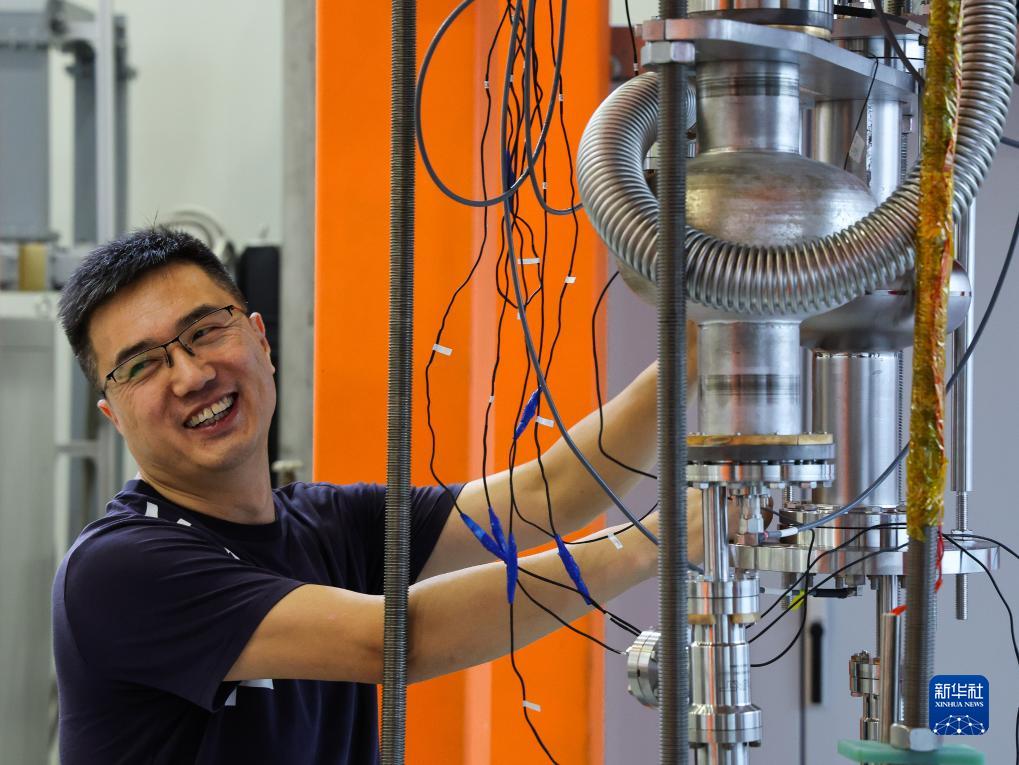 科研人員在中國(guó)散裂中子源加速器射頻技術(shù)實(shí)驗(yàn)室維護(hù)設(shè)備(7月18日攝)。