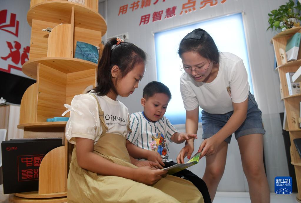 7月26日,在廣西上橫高速公路建設項目部,來自陜西省寶雞市的荔若溪(左一)和來自廣西來賓市的韋靖楷(左二)在大人的指導下看書。