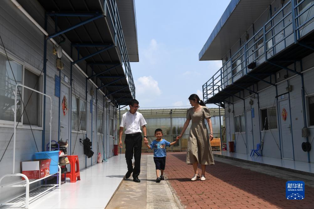 7月26日,在廣西上橫高速公路建設工地職工宿舍區,來自湖北省麻城市的劉宇燦和爸爸媽媽從活動板房前走過。