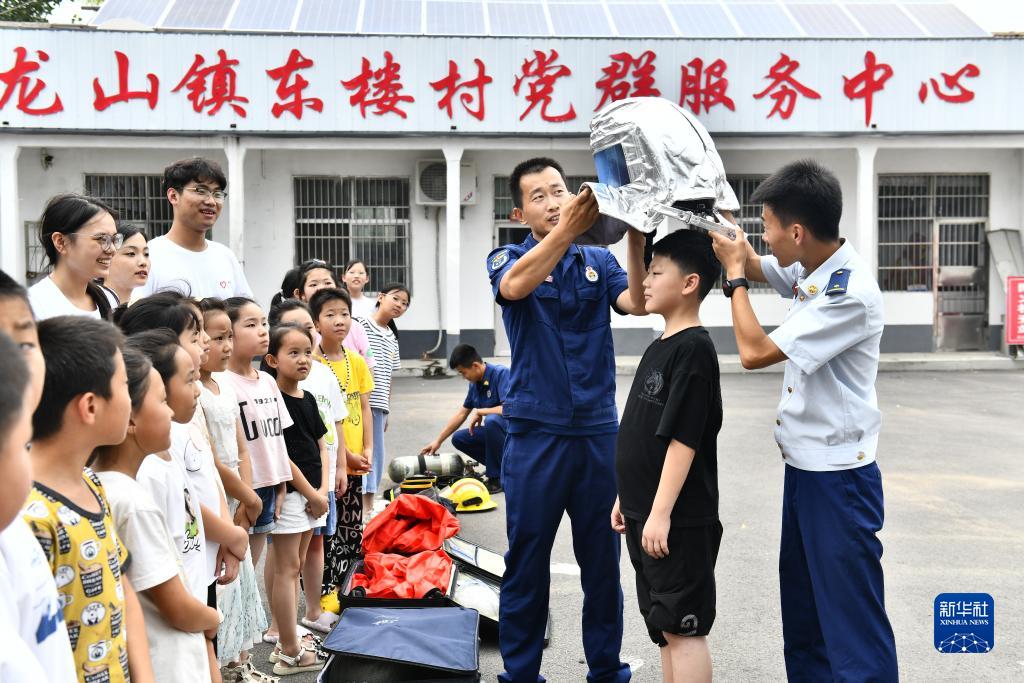 7月26日,在莒縣龍山鎮東樓村“小草學堂”,莒縣消防救援大隊的指戰員為孩子試穿防護服并講授消防安全知識。
