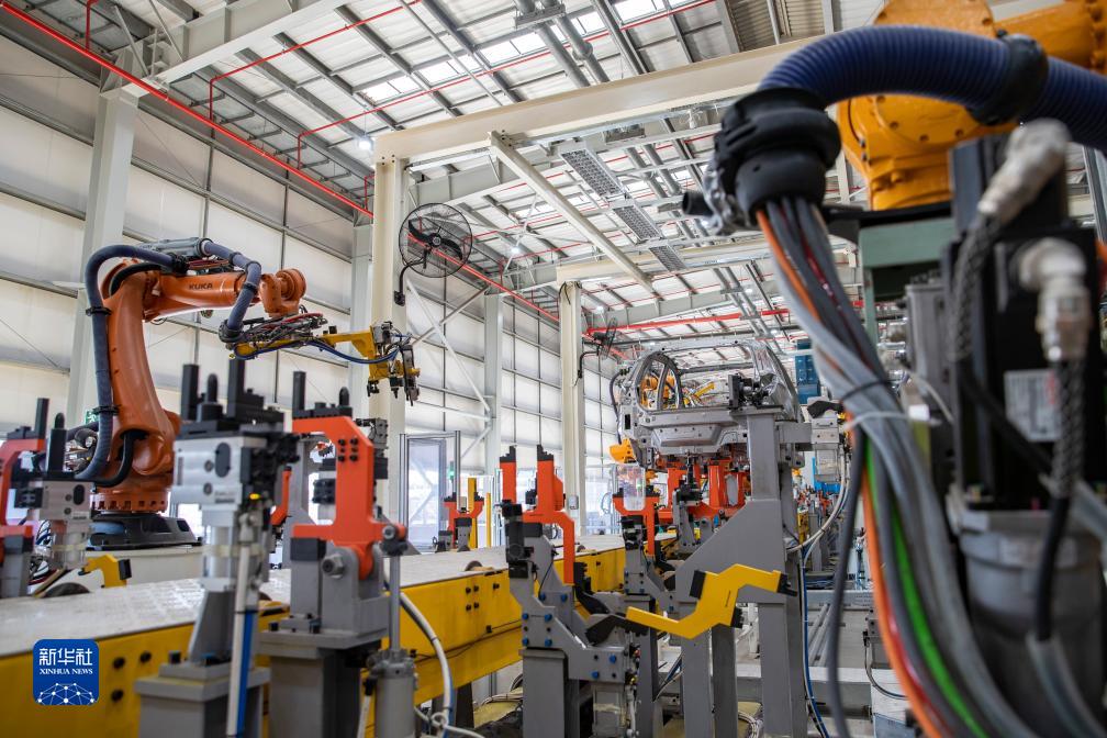 這是5月9日在南非東開普省北汽南非工廠拍攝的焊裝車間生產線。
