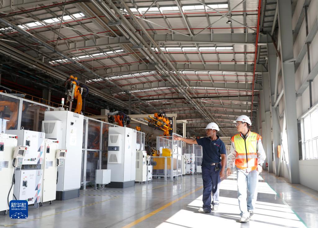 5月10日,在南非東開普省北汽南非工廠,邦加尼(左)與中國同事方龍在工作中交流。