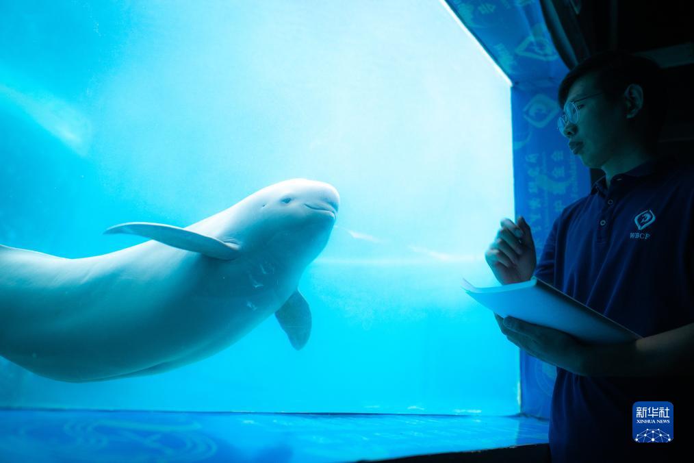 7月5日,中國科學(xué)院水生生物研究所白鱀豚館訓(xùn)練員鄧正宇對一頭長江江豚進(jìn)行觀察。