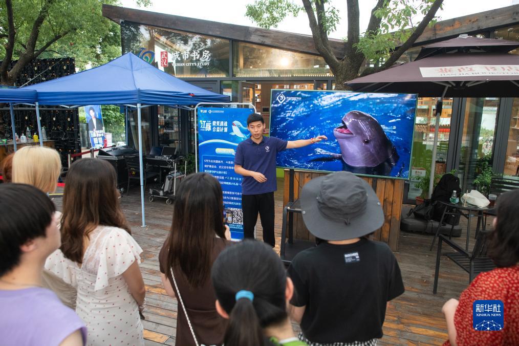 6月28日,科普講師何俊逸在武漢漢口江灘為市民做長江江豚保護科普。