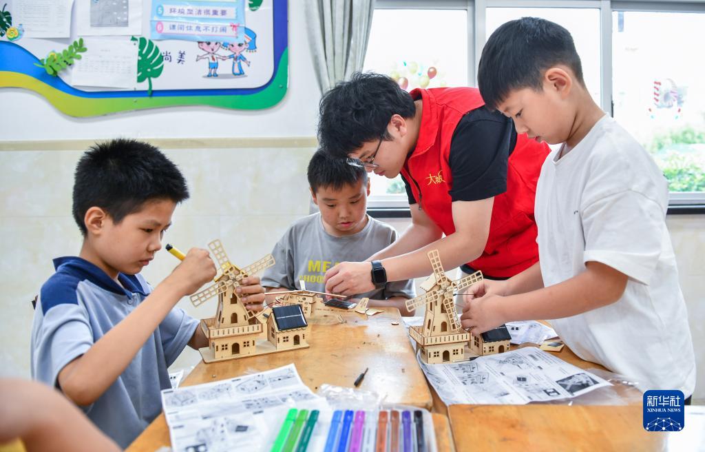 7月27日,在余姚市舜北小學暑托班內,志愿者和孩子們一起制作太陽能科學實驗裝置。
