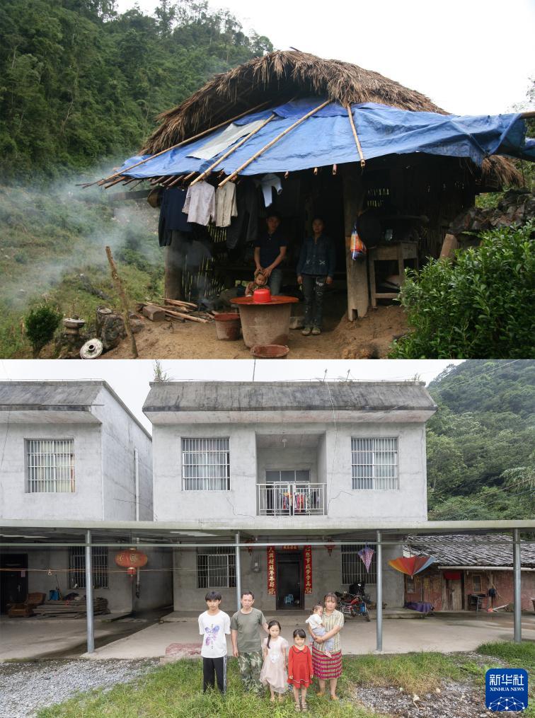 這是一張拼版照片:上圖為2008年11月14日,陶文學(xué)(前左)和父母一起站在茅草屋前合影(新華社記者張愛林?jǐn)z);下圖為2023年7月30日,陶文學(xué)(左一)和父親陶建明(左二)以及繼母和三個(gè)妹妹在新居前合影(新華社記者費(fèi)茂華攝)。