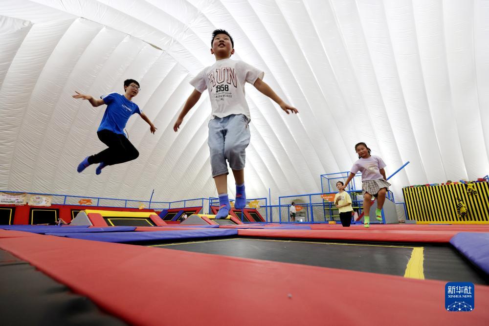8月2日,孩子們在山東省棗莊市冰雪文體中心蹦床上進(jìn)行蹦跳鍛煉。