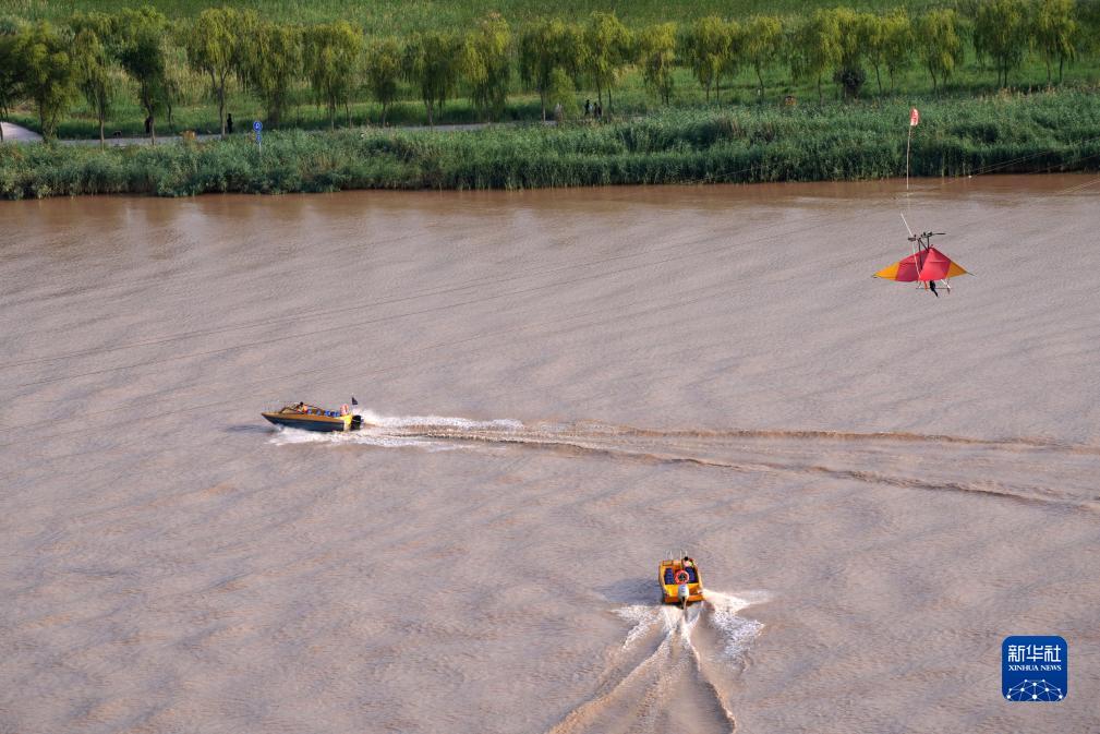 8月2日,游客在寧夏中衛市沙坡頭景區體驗飛渡黃河、快艇。