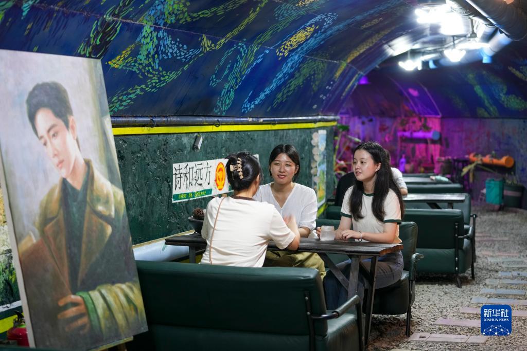 8月2日,人們在重慶市九龍坡區黃桷坪街道的石頭房子藝術空間避暑納涼。