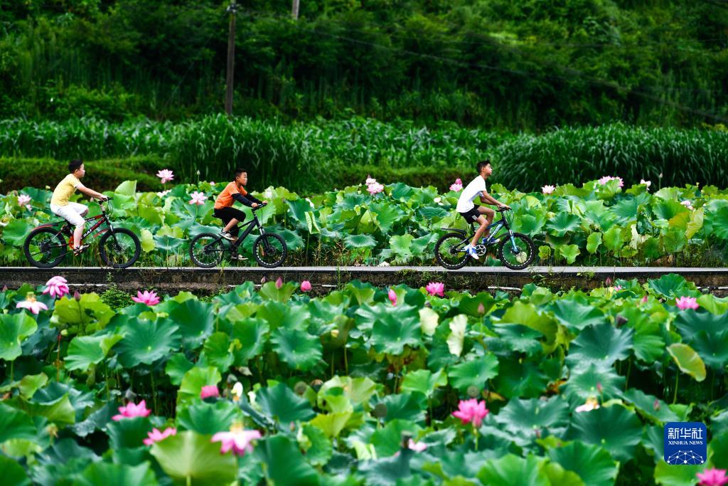 8月2日,孩子們在貴州省岑鞏縣客樓鎮下寨村騎行游玩。