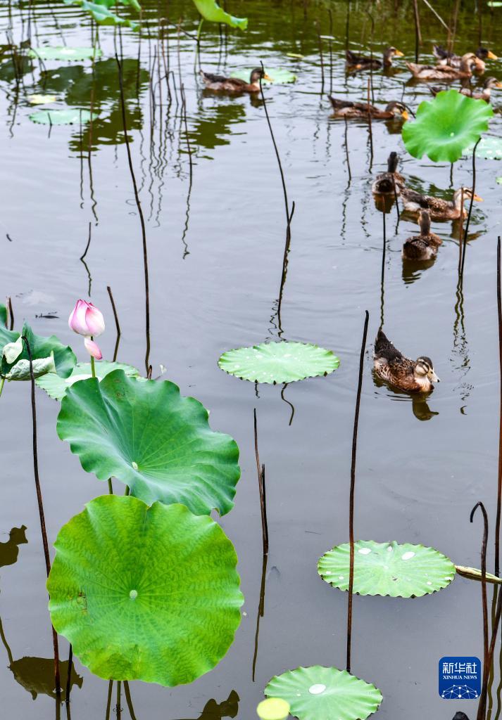 8月2日,鴨子在貴州省岑鞏縣客樓鎮(zhèn)下寨村的荷塘里覓食。