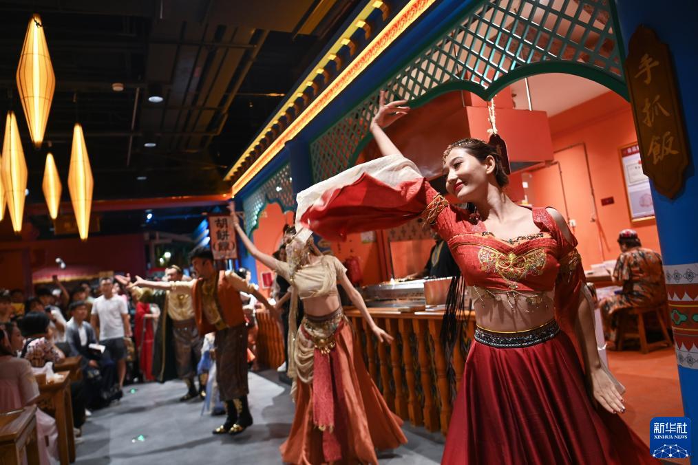 8月2日,游客在長安十二時辰主題街區觀看唐風演藝《胡姬酒肆》。