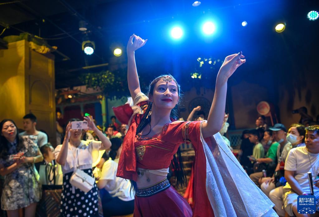 8月2日,游客在長安十二時辰主題街區觀看唐風演藝《胡姬酒肆》。