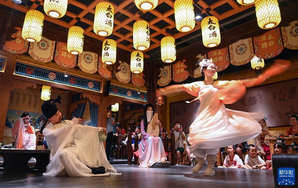 8月2日,游客在長安十二時辰主題街區觀看唐風演藝《將進酒》。