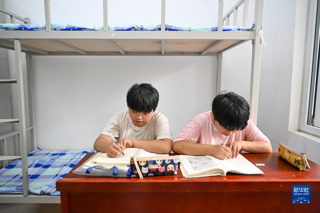 8月3日,在天津市靜海區(qū)第六中學臨時安置點,學生在寫作業(yè)。