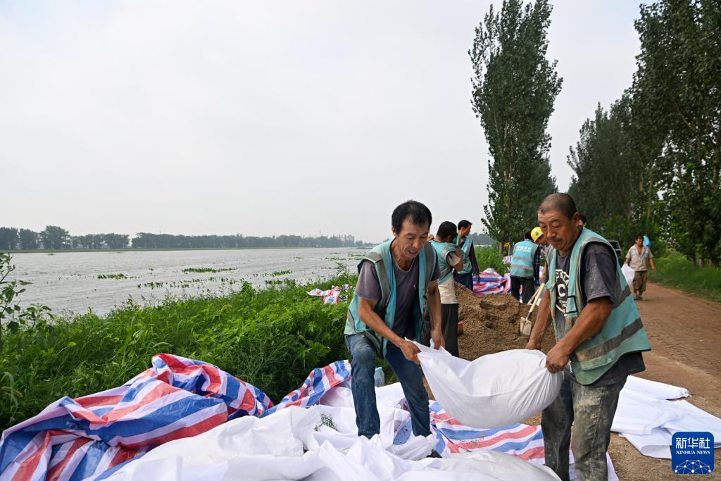 當(dāng)日,來自中建、中交等多個單位的工人和靜海區(qū)當(dāng)?shù)卮迕窆睬в嗳嗣β翟诖笄搴犹旖蚴徐o海段南北兩岸,持續(xù)進(jìn)行兩岸堤壩加高加固工作,以應(yīng)對大清河河道內(nèi)不斷增長的上游來水。
