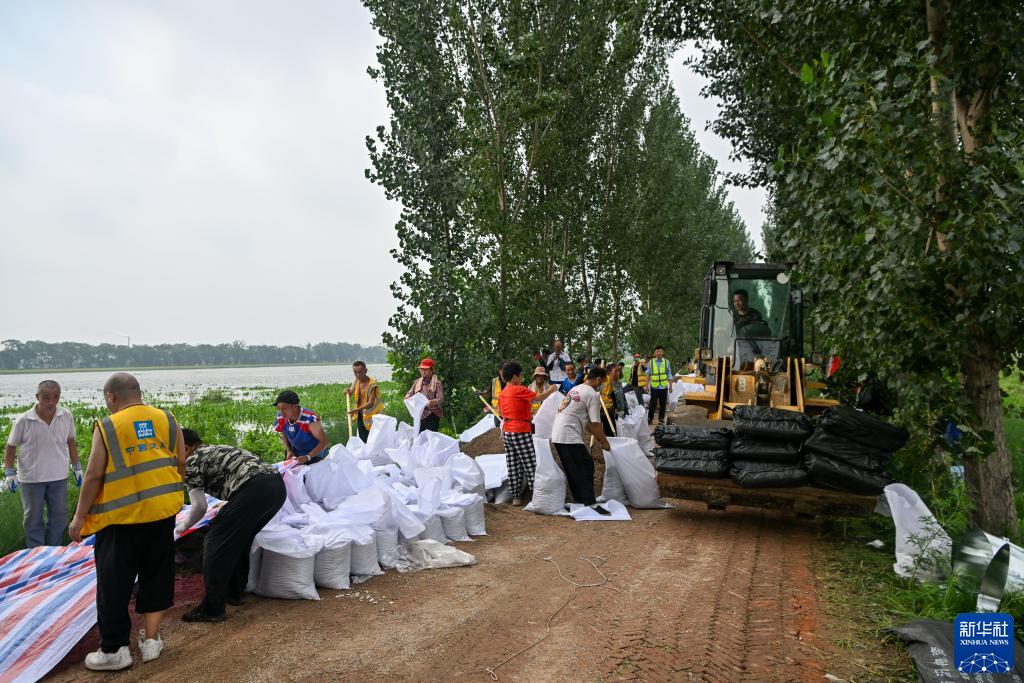 當日,來自中建、中交等多個單位的工人和靜海區當地村民共千余人忙碌在大清河天津市靜海段南北兩岸,持續進行兩岸堤壩加高加固工作,以應對大清河河道內不斷增長的上游來水。