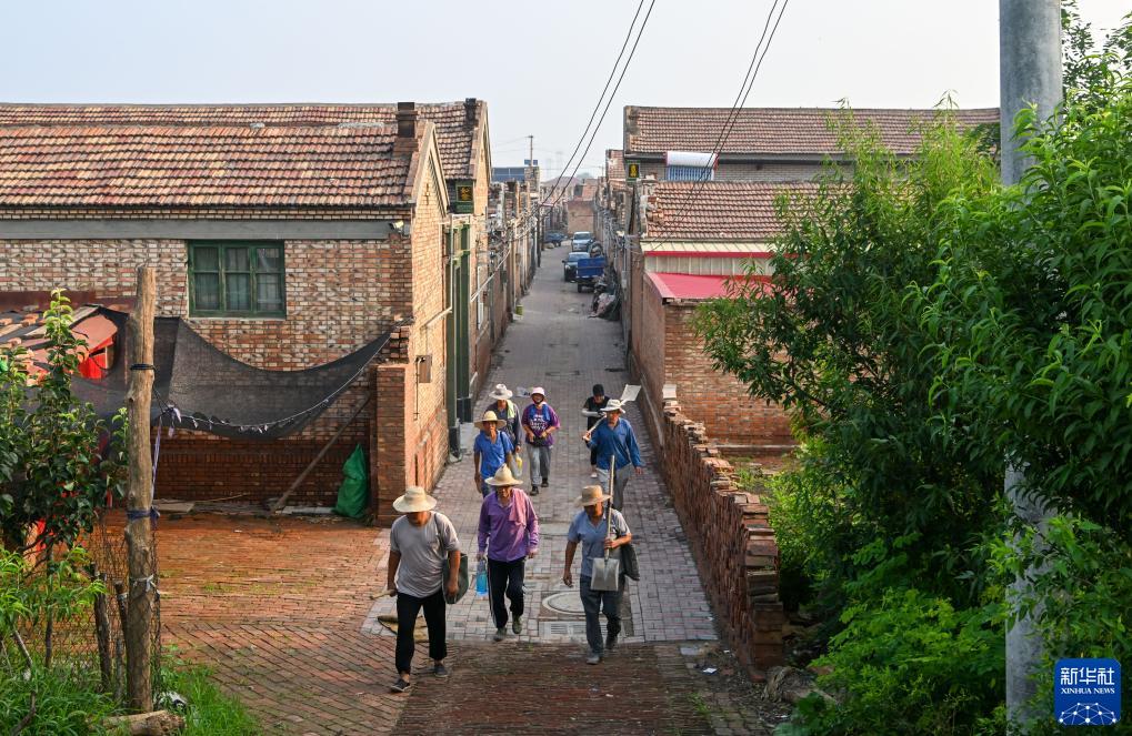8月3日,在天津市靜海區臺頭鎮建設村,村民從村內走到河岸堤壩上參與堤壩加高加固工作。