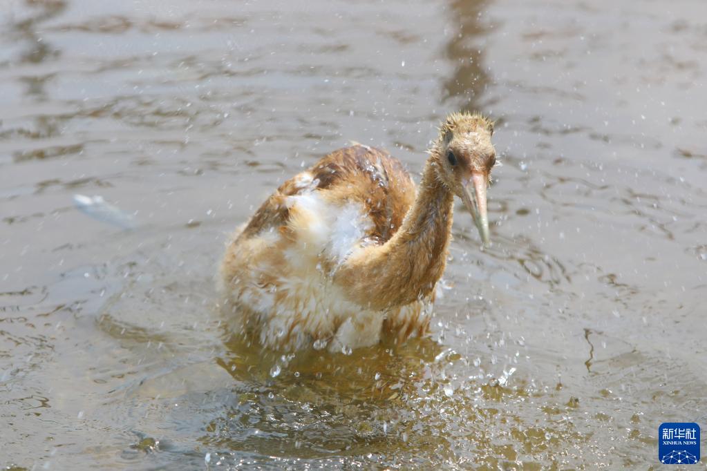 8月3日,丹頂鶴雛鳥在保護站內戲水。