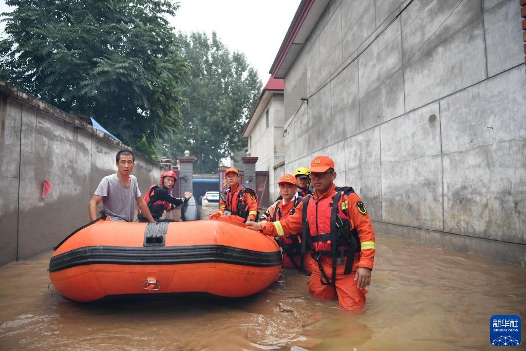 8月3日,衡水市消防救援支隊救援人員在涿州市碼頭鎮沙窩村內開展救援工作。