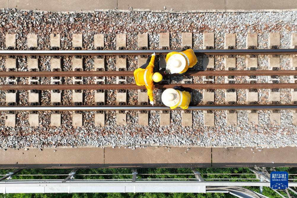 8月3日,中國鐵路上海局集團有限公司徐州電務段工作人員進行軌道電路檢測(無人機照片)。